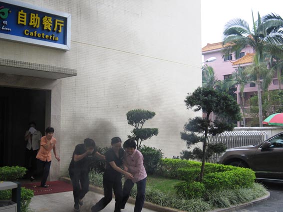 講解后,各部門人員按照方案要求到各區(qū)域就位。溫泉部、客房部、餐飲部員工扮演客人分別到北樓各樓層客房中等待疏散。由保安部人員用香煙引響消防警鈴,消防控制室當(dāng)班人員立刻到控制室了解著火點(diǎn)位置,并呼叫當(dāng)班保安人員到著火點(diǎn)查看,模擬發(fā)現(xiàn)火情難控制后,立即呼叫滅火行動組人員緊急滅火,并通知前臺。前臺立即用對講機(jī)呼向各部門報(bào)告著火地點(diǎn),啟動火警區(qū)域的緊急疏散,并立即呼叫119增援。各樓層立即組織客人疏散,只見員工紛紛迅速從樓層中逃出,彎著腰并用濕毛巾捂住口鼻,有序地沿著樓梯樓快速撤離到安全地帶。另一邊,辦公室、財(cái)務(wù)、保潔人員負(fù)責(zé)對逃出人員進(jìn)行現(xiàn)場救助,并開展警戒及通道引導(dǎo)工作。