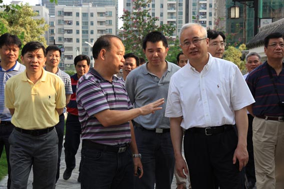5月23日,廣東省住建廳廳長(zhǎng)王芃一行在云浮市及新興縣有關(guān)領(lǐng)導(dǎo)的陪同下到筠州花園調(diào)研。左圖為集團(tuán)總裁崔健平正在為王芃廳長(zhǎng)介紹項(xiàng)目建設(shè)情況。
