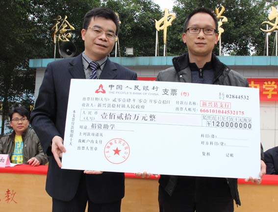 房地產(chǎn)總經(jīng)理鄺紹榮代表翔順集團(tuán)與稔村鎮(zhèn)政府簽訂《捐資興建新興縣稔村鎮(zhèn)初級中學(xué)教師宿舍樓協(xié)議書》,并向政府捐贈120萬元支票;鐘佐彪代表稔村鎮(zhèn)政府向我集團(tuán)頒發(fā)“捐資建校,傳誦千古”牌匾。