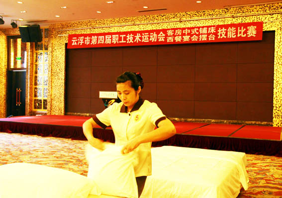 據(jù)了解,市第四屆職工技術(shù)運(yùn)動(dòng)會(huì)由云浮市總工會(huì)組織、由各縣(市、區(qū))總工會(huì)選派代表參賽。經(jīng)縣總工會(huì)、集團(tuán)工會(huì)和酒店領(lǐng)導(dǎo)的初選,派出龍山酒店客房部員工趙雁英和花園酒店客房部員工陳玉冰代表縣總工會(huì)參加客房中式鋪床技能項(xiàng)目比賽。本次客房中式鋪床比賽在云浮碧桂園鳳凰酒店一樓宴會(huì)廳舉行,分儀容儀表展示和鋪床實(shí)操兩部份,全市五個(gè)縣(市、區(qū))共八名選手參賽。