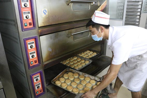 月餅生產(chǎn)線上的員工按照規(guī)定必須統(tǒng)一穿上工作服和工作鞋,手要經(jīng)過嚴(yán)格的消毒,確保生產(chǎn)過程的干凈、衛(wèi)生。生產(chǎn)前還要把原材料貯備齊全。記者發(fā)現(xiàn),酒店為確保月餅質(zhì)量,所選購的原材料都是知名品牌廠家的產(chǎn)品,從花生油、面粉到各種餡料,都經(jīng)過層層把關(guān)和嚴(yán)格選料。