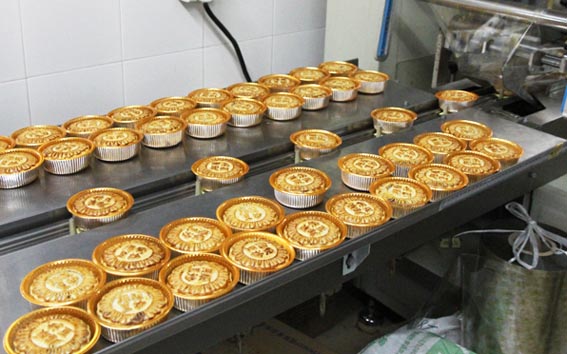 包好餅皮后,就要用成型機(jī)壓制成型了。師傅們根據(jù)不同餡料的月餅,在成型機(jī)上裝上印有對應(yīng)餡料的模版。由于成型機(jī)靠的是感應(yīng)壓模,月餅放置的位置也很有講究,位置稍有偏差就會壓制不均衡,這時就要重新做過了。制作師傅在壓制時都保證每個月餅大小基本一致,確保質(zhì)量符合要求。