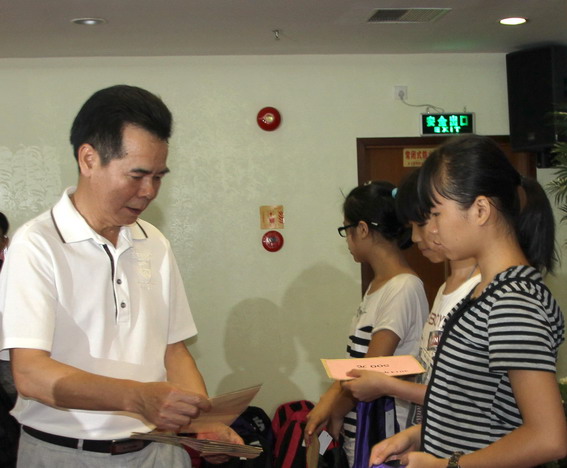 儀式上,區(qū)耀啟、梁國華、陳啟雄、龍飛波、崔健全、鐘世雄向60名貧困學生代表贈送了學習用品和助學金。