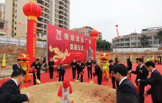 10時(shí)許,在醒獅點(diǎn)睛的熱烈氣氛烘托下,集團(tuán)領(lǐng)導(dǎo)崔健全、鐘世雄、潘錦基、鄺紹榮等共同為鳳凰廣場(chǎng)項(xiàng)目奠基培土,宣告翔順首個(gè)商業(yè)地產(chǎn)項(xiàng)目正式啟動(dòng)。