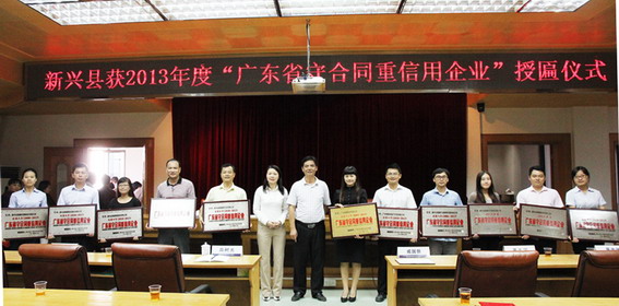 10月15日,新興縣獲2013年“廣東省守合同重信用”的授牌儀式在縣工商局七樓會議室舉行??h46家企業(yè)接受表彰,翔順集團及十家下屬公司獲得該稱號(下圖為翔順十一家公司合影),其中翔順集團連續(xù)13年被授予該稱號。